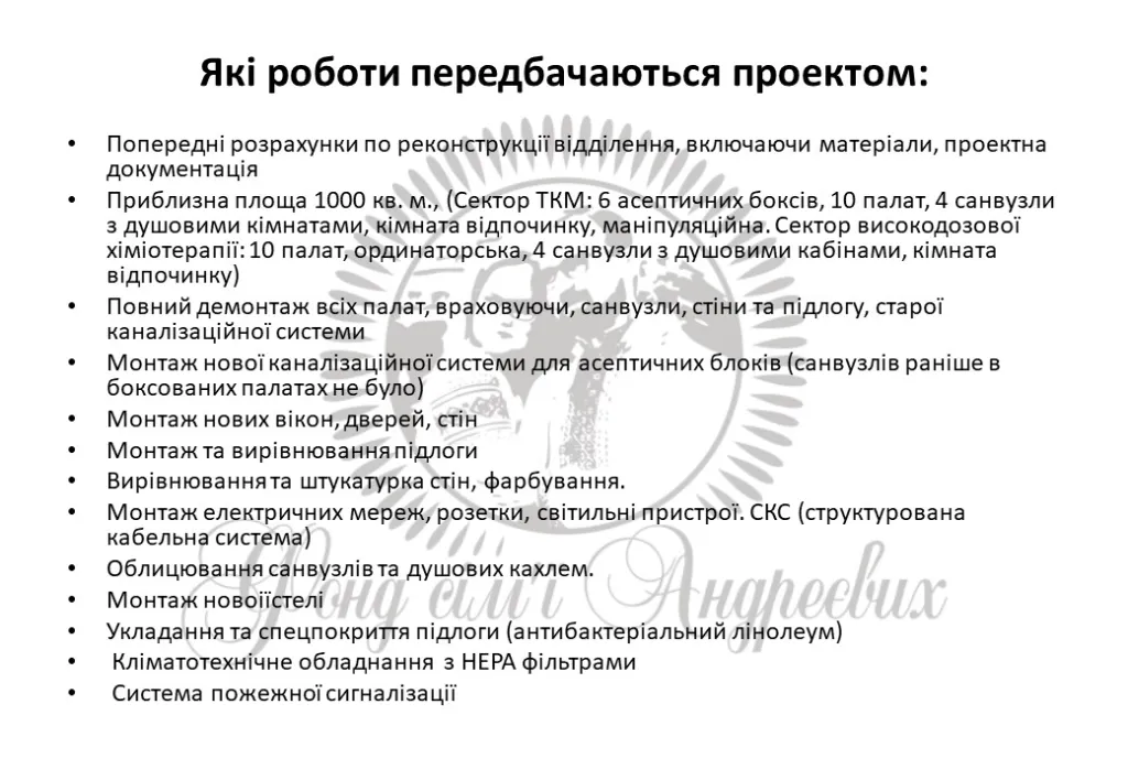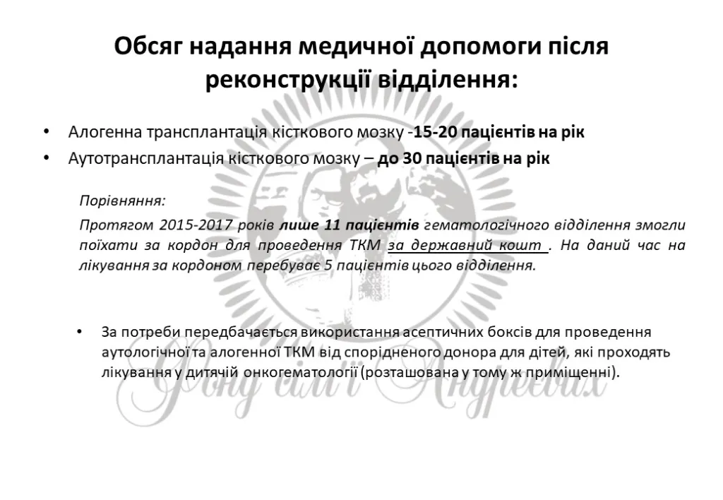 Загальна площа реконструкції – 1000 кв.м. Вартість повної реконструкції – 40 мільйонів гривень. Це вартість 10-15 трансплантацій кісткового мозку за кордоном. Лише за один минулий рік ми відправили в сусідні країни на ТКМ більше сотні пацієнтів.
