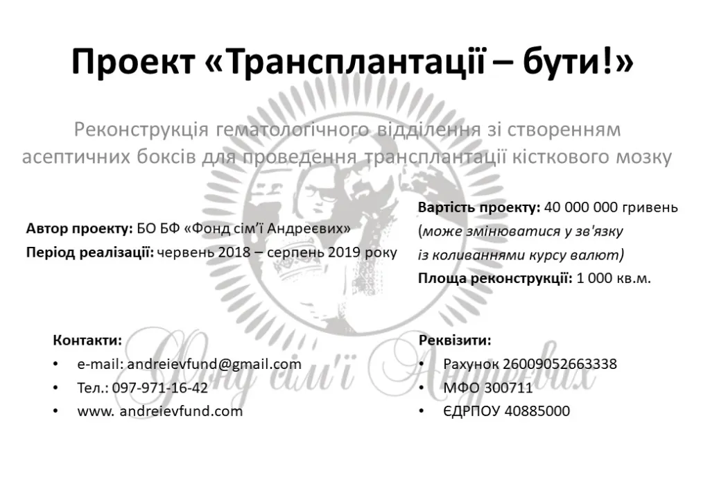 За ці гроші ми можемо створити стерильні бокси і відремонтувати відділення онкогематології, створивши належні умови для проведення трансплантацій кісткового мозку. Тоді у важкохворих пацієнтів зявиться шанс отримати необхідну медичну допомогу в Україні. І тільки за один рік роботи такого відділення ми з вами врятуємо 30-40 людей! А ще це дасть можливість економити кошти пацієнтів та держави. Нам під силу створити європейські умови для проведення таких операцій!