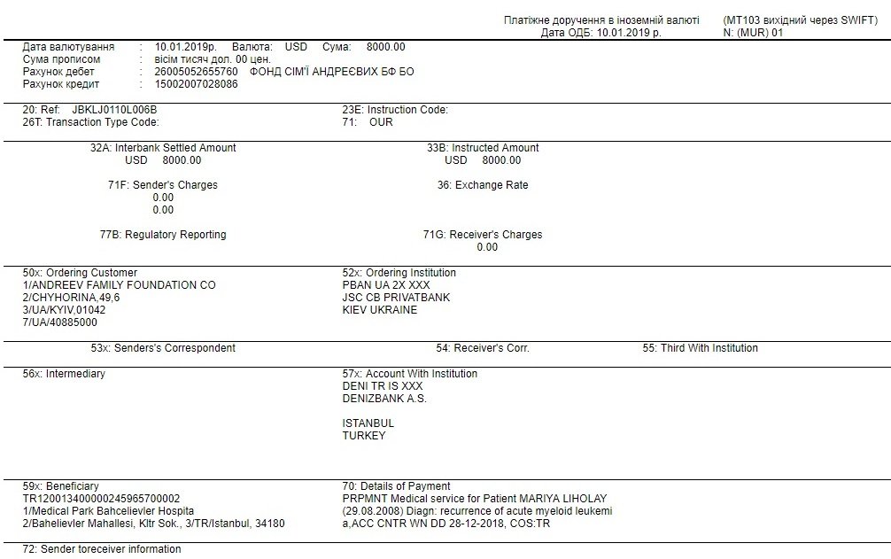10 січня наша благодійна організація перерахувала до турецької клініки вісім тисяч доларів, як частину оплати за лікування Марійки. Це ті кошти, які були зібрані небайдужими українцями.